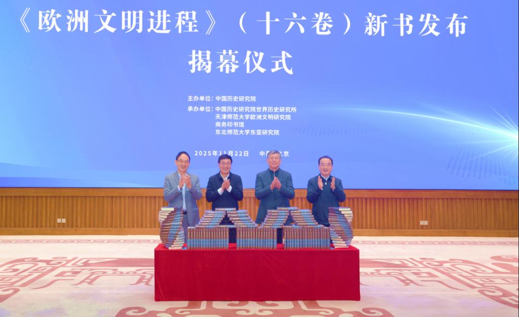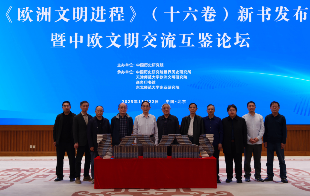 中国历史研究院坐落在北京奥林匹克公园中心文化区,整个建筑似鼎如尊、庄严肃穆。2025年11月22日,由中国历史研究院主办,中国历史研究院世界历史研究所、天津师范大学欧洲文明研究院、商务印书馆、东北师范大学东亚研究院联合承办的《欧洲文明进程》(十六卷)新书发布会暨中欧文明交流互鉴论坛,在这里隆重举行。出席会议的有北京大学资深教授、93岁高龄的马克垚先生;中国社会科学院学部委员,中国历史研究院党委常委、副院长李国强;首都师范大学讲席教授、国别区域研究院战略专家刘新成;商务印书馆党委书记、执行董事顾青;中国历史研究院党委常委、世界历史研究所所长刘作奎;天津市人大常委会原党组副书记、副主任陈浙闽;天津市委宣传部副部长徐中;天津师范大学党委书记曲凯;天津师范大学资深教授、《欧洲文明进程》(十六卷)主编侯建新。