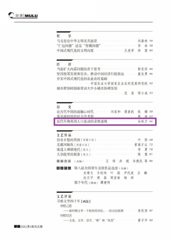 天津师范大学教授、欧洲文明研究院副院长谷延方的论文《近代早期英国人口流动的多维透视》被《新华文摘》2026年第7期转载。