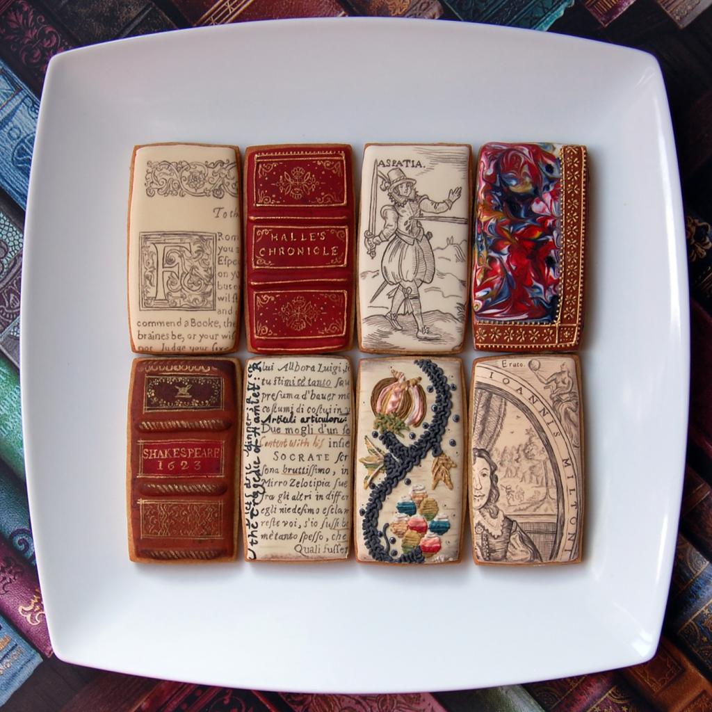 A biscuit set inspired by early modern books in the Shakespeare Birthplace Trust and Folger Shakespeare Library collections. The biscuit inspired by Folger First Folio 16 is located at the lower-left corner of the set. All photographs by the author.