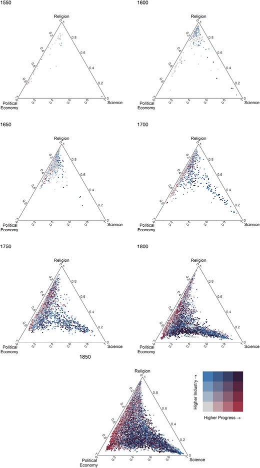 Each dot represents a volume. For each year, all volumes ± 10 years are included (i.e., for 1800 all volumes from 1790 to 1810 are included). The shade of each dot represents the sentiment of that volume along both the industry and progress axes.