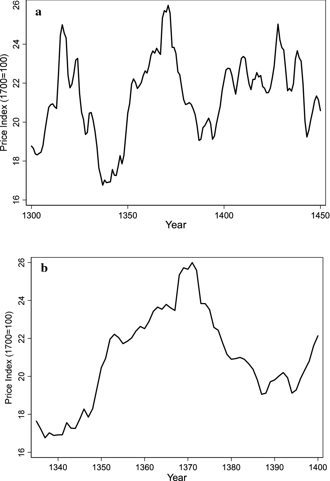 a Evolution of the price level. b Evolution of the price level (1335–1400)